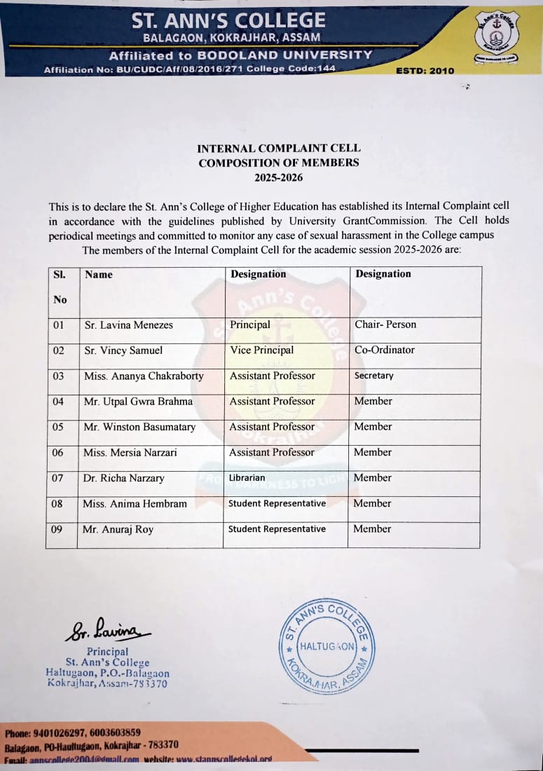 St. Ann’s College, Balagaon, Kokrajhar has constituted the Internal