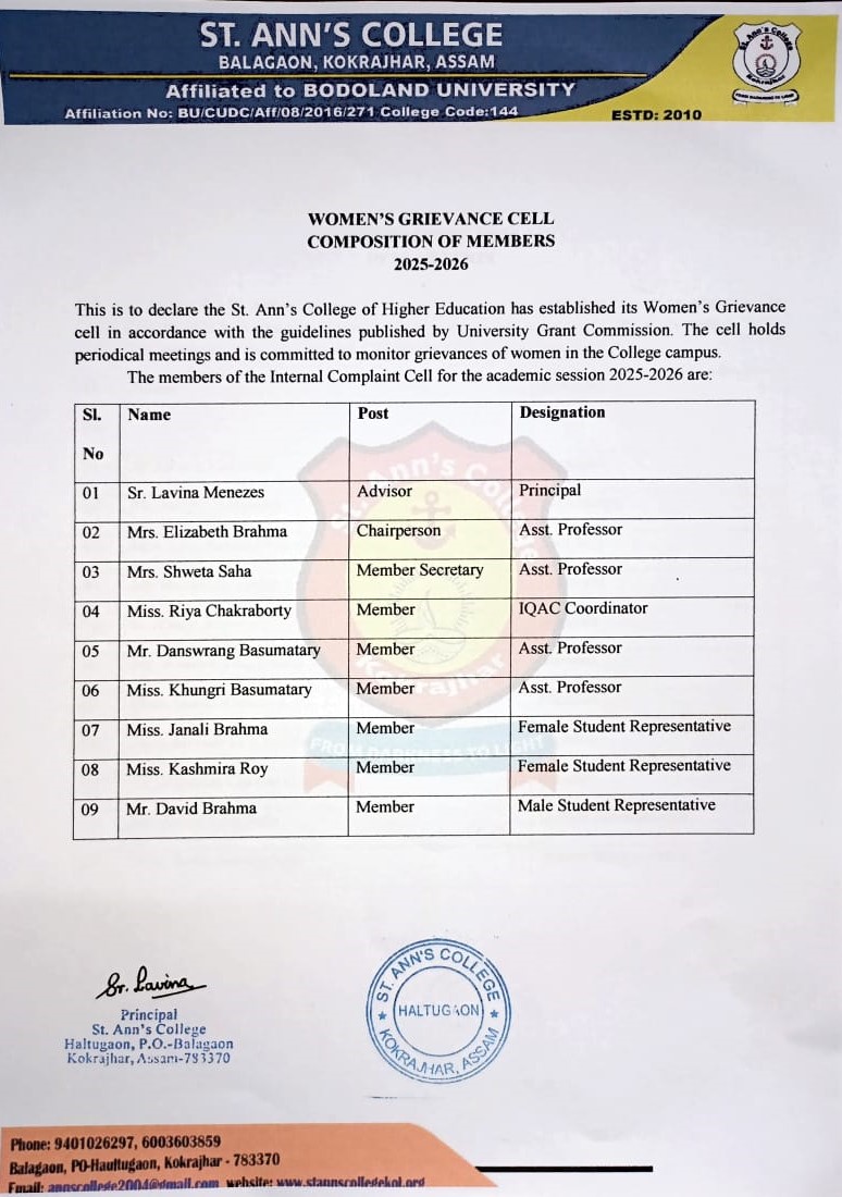 The Women's Grievance Cell is a dedicated platform for addressing concerns and complaints related to women's rights and issues. It's designed to provide support, guidance, and resolution for women facing problems like harassment, discrimination, or other forms of injustice. It's a safe space for women to voice their concerns and seek help. Its purpose is to provide a confidential mechanism for women to report complaints, particularly regarding sexual harassment, gender discrimination, and other related issues, and to ensure these grievances are handled promptly and appropriately. The cell investigates complaints, recommends actions, and works to prevent future issues by promoting a positive and inclusive environment.